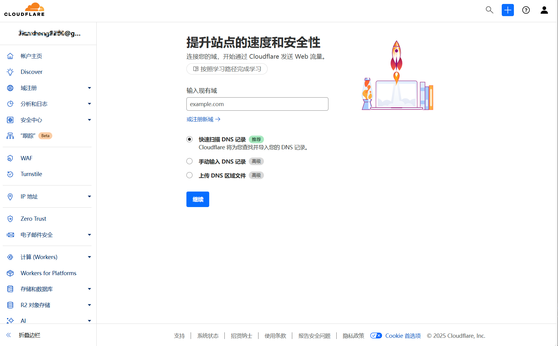 选择快速扫描,输入域名,点击“继续”进行添加。