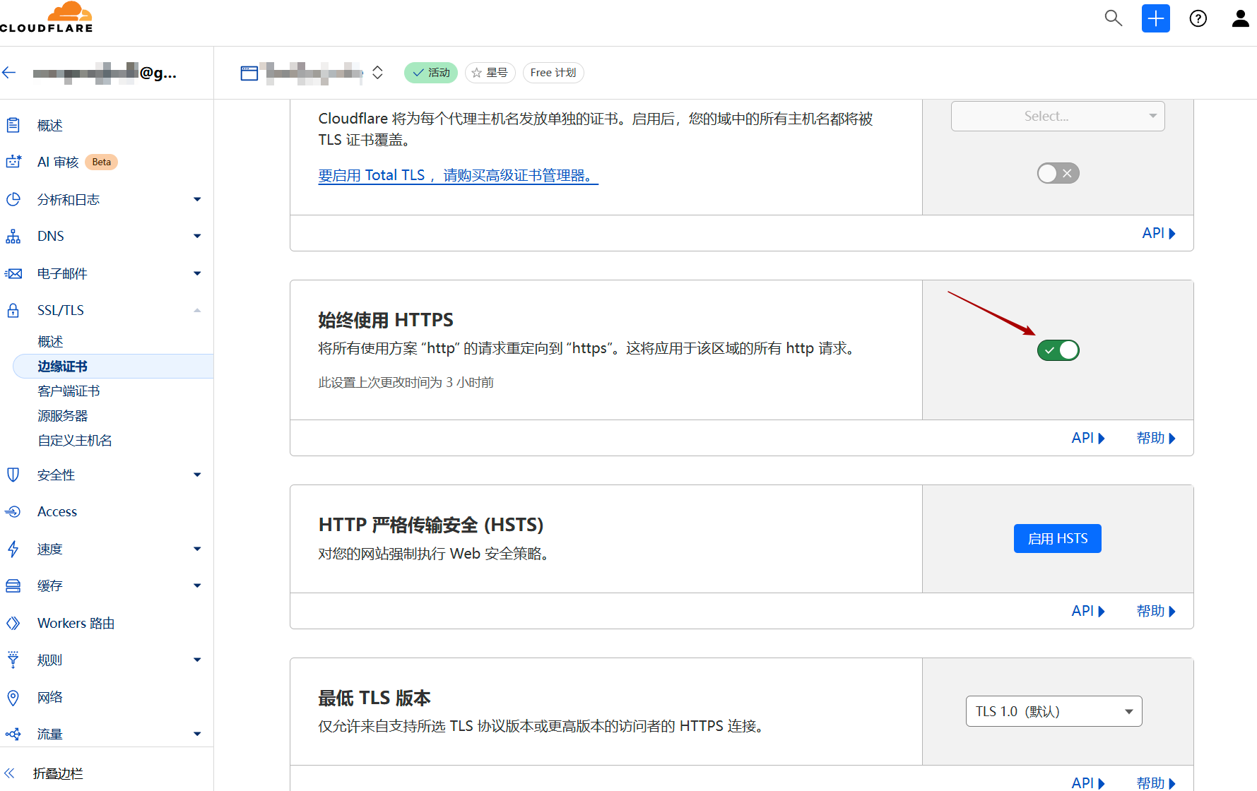 在“边缘证书”下面,打开“始终使用HTTPS”
