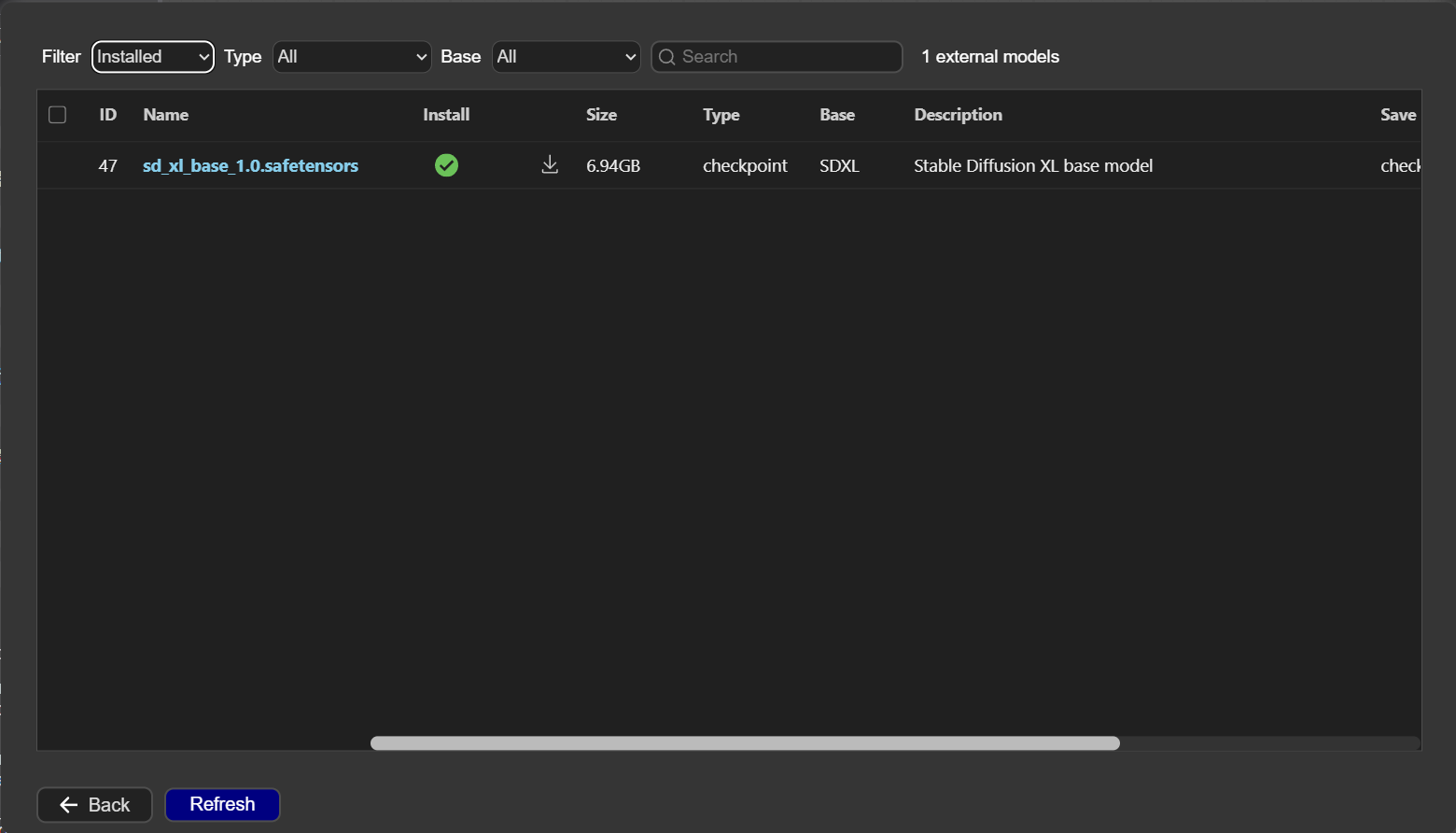 点击”Manager->model manager”, 安装sd_xl_base_1.0.safetensors