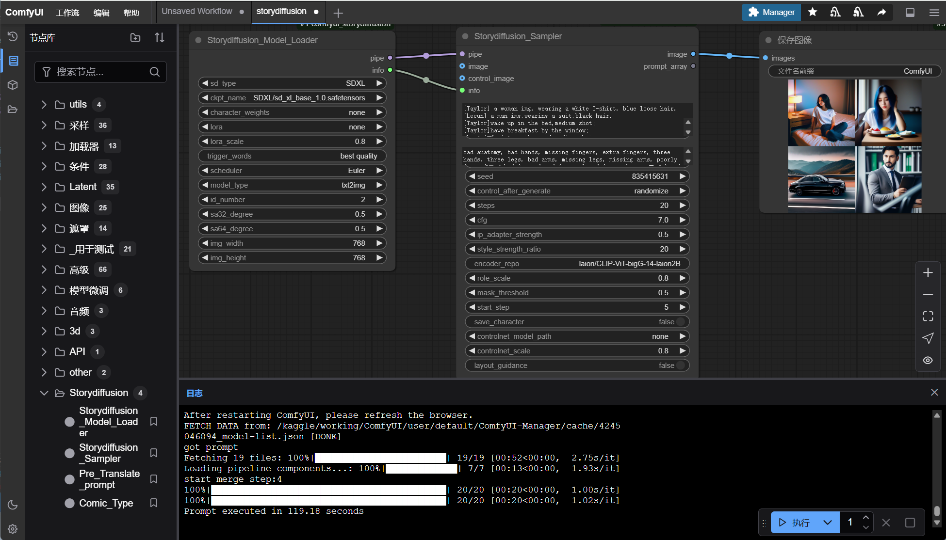 { "1": { "inputs": { "sd_type": "SDXL", "ckpt_name": "SDXL/sd_xl_base_1.0.safetensors", "character_weights": "none", "lora": "none", "lora_scale": 0.8, "trigger_words": "best quality", "scheduler": "Euler", "model_type": "txt2img", "id_number": 2, "sa32_degree": 0.5, "sa64_degree": 0.5, "img_width": 768, "img_height": 768 }, "class_type": "Storydiffusion_Model_Loader", "_meta": { "title": "Storydiffusion_Model_Loader" } }, "2": { "inputs": { "info": [ "1", 1 ], "character_prompt": "[Taylor] a woman img, wearing a white T-shirt, blue loose hair.\n[Lecun] a man img,wearing a suit,black hair.", "scene_prompts": "[Taylor]wake up in the bed,medium shot;\n[Taylor]have breakfast by the window;\n[Lecun] drving on the road,medium shot;\n[Lecun]work in the company.", "split_prompt": "", "negative_prompt": "bad anatomy, bad hands, missing fingers, extra fingers, three hands, three legs, bad arms, missing legs, missing arms, poorly drawn face, bad face, fused face, cloned face, three crus, fused feet, fused thigh, extra crus, ugly fingers, horn,amputation, disconnected limbs", "img_style": "No_style", "seed": 1185510095, "steps": 20, "cfg": 7, "ip_adapter_strength": 0.5, "style_strength_ratio": 20, "encoder_repo": "laion/CLIP-ViT-bigG-14-laion2B-39B-b160k", "role_scale": 0.8, "mask_threshold": 0.5, "start_step": 5, "save_character": false, "controlnet_model_path": "none", "controlnet_scale": 0.8, "layout_guidance": false, "pipe": [ "1", 0 ] }, "class_type": "Storydiffusion_Sampler", "_meta": { "title": "Storydiffusion_Sampler" } }, "3": { "inputs": { "filename_prefix": "ComfyUI", "images": [ "2", 0 ] }, "class_type": "SaveImage", "_meta": { "title": "保存图像" } }}