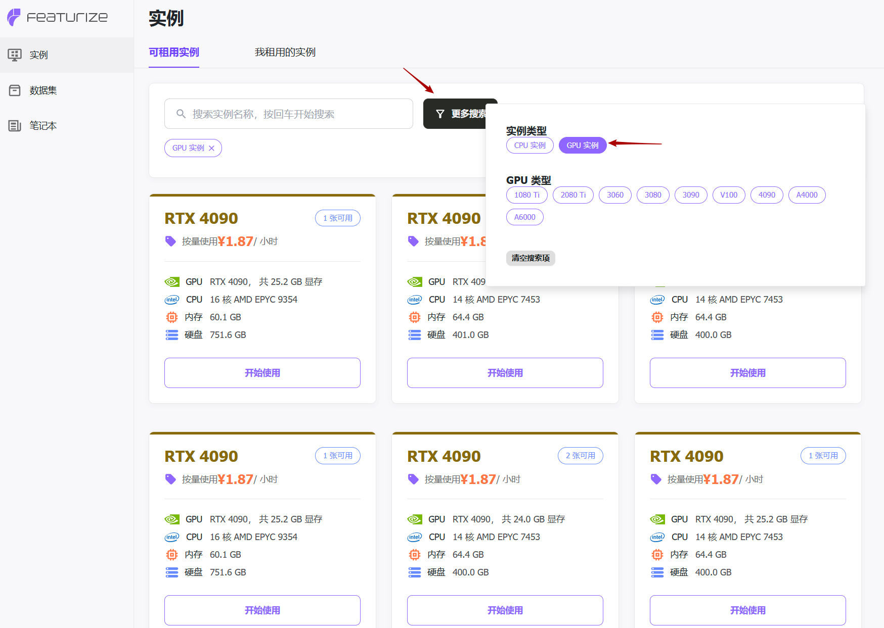 访问featurize网站并注册登录,筛选实例类型为GPU,选择想要租用的服务器并点击开始使用。