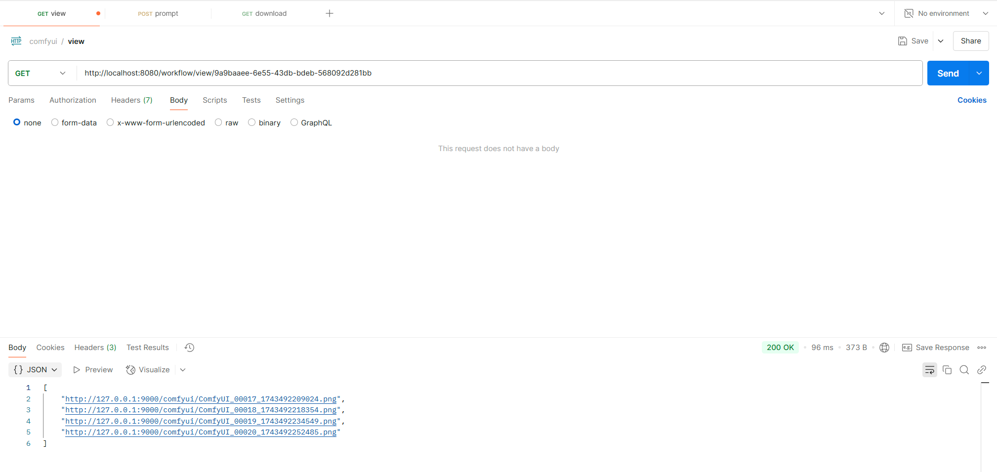 ServletOutputStream outputStream = response.getOutputStream(); IOUtils.copy(new FileInputStream(zipFile), outputStream); outputStream.flush(); } } catch (Exception e) { e.printStackTrace(); return ResponseEntity.ok("fail"); } return ResponseEntity.ok("success"); } /** * 查询结果 * @param promptId * @param response * @return 图片链接列表 */ @GetMapping("/view/{promptId}") public ResponseEntity<List<String>> view(@PathVariable("promptId") String promptId, HttpServletResponse response){ Optional<WorkFlow> workFlow = wrokflowService.findByPromptId(promptId); if(workFlow.isPresent() && workFlow.get().getCompleted()){ return ResponseEntity.ok(workFlow.get().getImages().stream().map(s->String.format("%s/%s/%s",host,bucket,s)).collect(Collectors.toList())); } return ResponseEntity.ok(new ArrayList<>()); }}通过定时任务,查询处理结果存入MongoDB和Minio