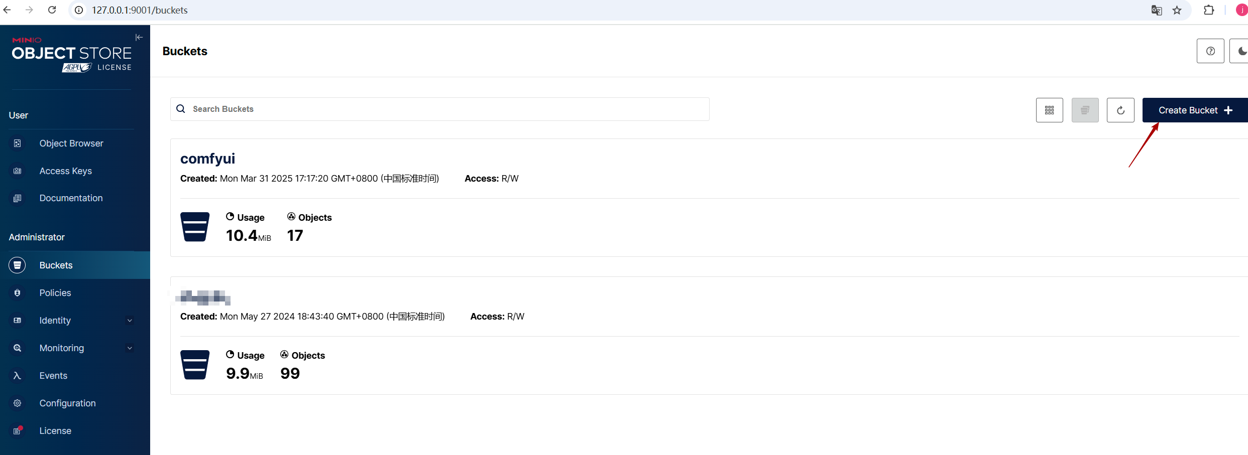 version : '3.8'name: workserverservices: mongo: image: mongodb/mongodb-community-server:5.0.24-ubuntu2004 container_name: mongo restart: on-failure:3 ports: - "27017:27017" volumes: - D:\DockerData\MongoData\db:/data/db - D:\DockerData\MongoData\configdb:/data/configdb minio: container_name: minio image: quay.io/minio/minio ports: - "9000:9000" - "9001:9001" environment: - "MINIO_ROOT_USER=xxxx" - "MINIO_ROOT_PASSWORD=xxxxxx" command: server --console-address ":9001" /data volumes: - D:\DockerData\MinioData:/data healthcheck: test: ["CMD", "mc", "ready", "local"] interval: 5s timeout: 5s retries: 5访问minio,创建专门的bucket